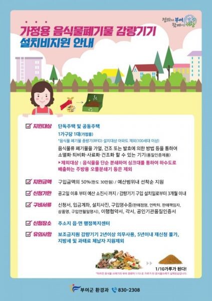 사업대상은 2020년 음식물류폐기물 감량기기 설치보조금 지원 계획 공고일 이전까지 부여군에 주소를 둔 세대주로서 지원금액은 기기 구입금액의 50%까지 지원한다.