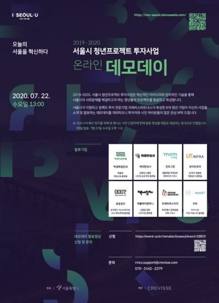 홈페이지 : http://rmc-seoul.donusweb.com/ 김영경 청년청장은 ”코로나19라는 유례없는 재난 상황에서도 청년기업과 청년단체들의 사회변화를 위한 과감한 실험이 지속가능한 도시를 위한 동력으로 이어질 수 있도록 온라인 데모데이를 개최하게 됐다.
