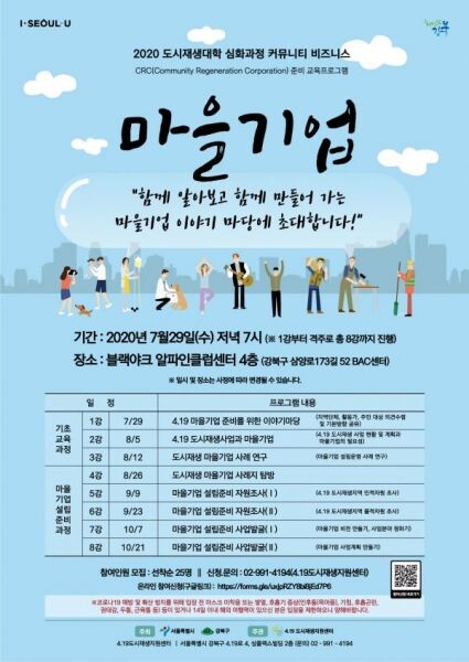 총 8강으로 진행되는 이번 과정은 4.19도시재생지역의 다양한 단체, 활동가와 주민이 폭넓게 참여해, 지역에 필요한 마을기업에 대한 생각을 공유하고 실제 마을기업 운영사례와 지역 내 다양한 인적·물적 자원을 조사함으로써, 주민역량을 강화하고 실제 마을기업 설립과 운영으로 이어질 수 있도록 지원할 계획이라고 전했다.