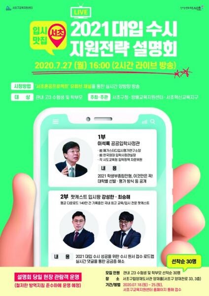 서울 서초구는 27일 오후 4시, 대입 수시 원서 접수를 앞둔 고3수험생과 학부모를 대상으로 ‘2021 대입 수시 지원전략 설명회’를 연다.