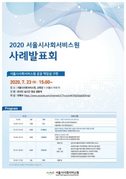 서울시사회서비스원 소속기관의 돌봄서비스 제공 1주년을 기념해 개최하는 ‘2020 서울시사회서비스원 사례발표회’는 코로나19로 인해 온라인을 통해 행사를 진행하며 유튜브 채널을 통해 실시간 생중계한다.