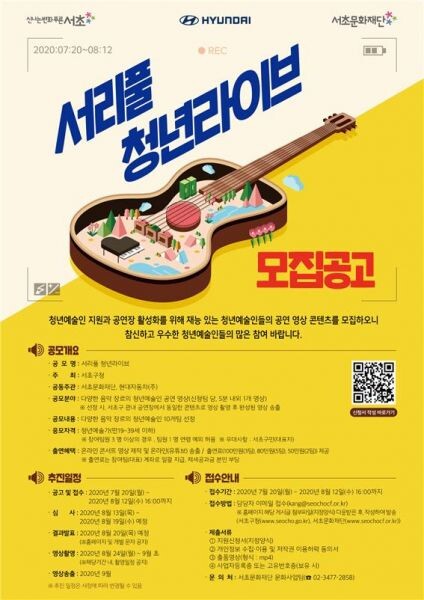 [무한뉴스] 서울 서초구는 서초문화재단, 현대자동차 남부지역본부와 함께 실력 있는 청년예술인들을 발굴하고 침체된 공연장을 활성화하기 위한 언택트 온라인 문화공연‘서리풀 청년라이브’에 참여할 청년예술인들에 대한 공모를 추진한다고 밝혔다.