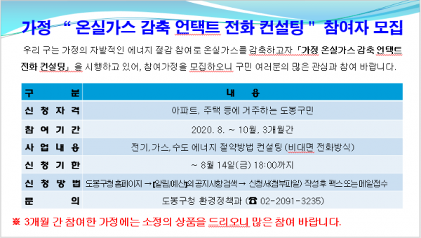 [무한뉴스] 도봉구는 가정의 자발적인 에너지 절약을 통해 온실가스를 줄이기 위한 ‘온실가스 감축 언택트 전화 컨설팅’ 사업을 진행한다.