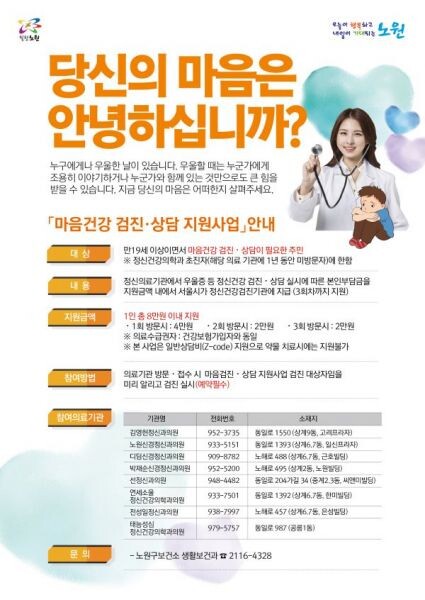 오승록 노원구청장은 “정신건강을 해치는 위험요인을 조기 발견해 치료하는 것이 무척 중요하다”며 “코로나로 인해 정신적으로 어려움을 겪고 있는 주민들을 적극적으로 발굴해 다양한 서비스를 제공하겠다”고 밝혔다.