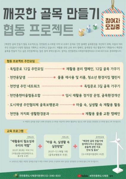 또한 ‘천연충현 마을협동조합’이 임시 재활용 정거장 운영과 골목환경개선 ‘천연충현 도시재생주민협의체 골목보행분과’가 마을 속, 실생활 속 재활용 활동 천연동 주민자치회 생활환경분과가 재활용 물품교환 캠페인을 각각 펼친다.