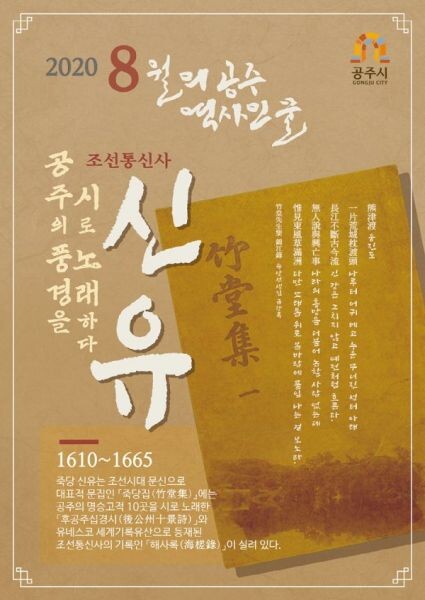 [무한뉴스] 공주시는 8월 이달의 역사인물로 공주의 풍경을 시로 노래한 조선통신사 ‘죽당 신유’를 선정했다.