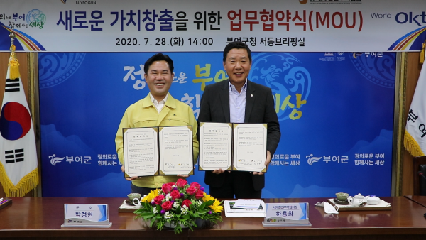 [무한뉴스] 2020년 7월 28일 부여군청 브리핑실에서 부여군과 세계한인무역협회는 글로벌 인재육성, 지역경제 활성화, 굿뜨래 농특산품 판로개척, 관광 활성화, 문화유산 지키기 등 새로운 가치 창출을 위한 업무협약식을 체결했다.