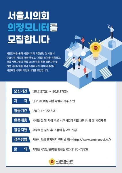 접수방법은 서울시의회 홈페이지의 ‘시민참여 → 의정모니터 → 후반기 의정모니터 신규모집’ 게시판에 지원서를 제출하면 된다.