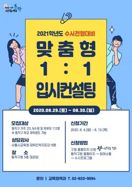 [무한뉴스] 동작구가 수험생과 학부모에게 정확한 입시 정보를 제공하고자 ‘2021학년도 대입 수시전형 맞춤형 1:1 입시컨설팅’을 개최한다고 밝혔다.
