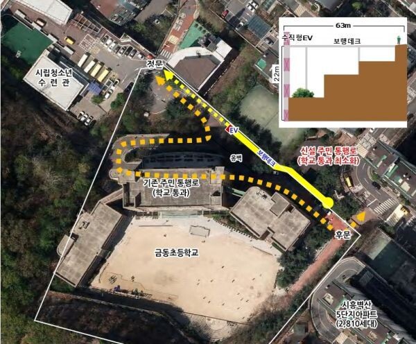 협약에 따라 금동초교내 급경사구간에 수직형 엘리베이터와 보행데크를 설치, 그간 학교 내 가파른 경사로를 따라 거주지를 오가던 지역주민의 이동편의가 크게 개선될 전망이다.
