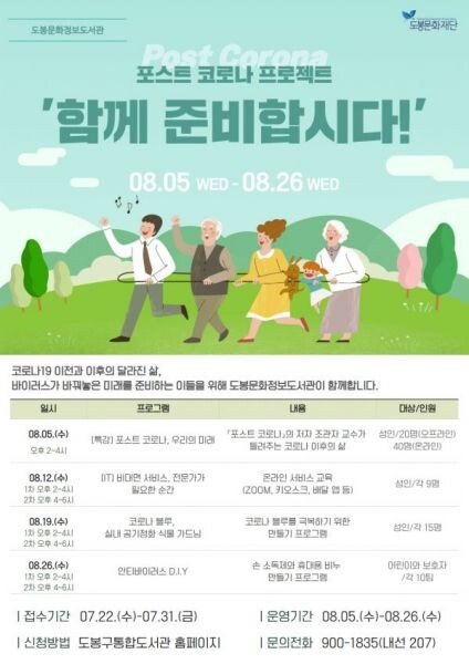 [무한뉴스] 도봉구는 오는 8월 5일부터 8월 26일까지 8월 한 달 간 매주 수요일 도봉문화정보도서관에서 포스트 코로나 프로젝트 ‘함께 준비합시다’를 운영한다.