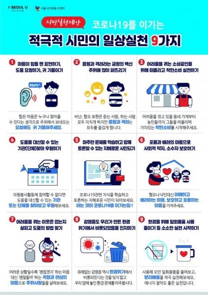 상반기 시민들이 보여준 다양한 실천사례처럼 어려움을 극복하는 힘은 시민에서부터 나온다는 점을 상기하며 하반기 코로나19 상황을 함께 극복하는데 필요한 적극적 시민의 일상 실천 9가지를 제안한다.