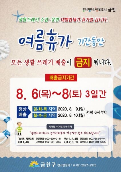 김만순 청소행정과장은 “청소 대행업체 환경미화원들의 재충전을 위해 여름휴가를 실시한다”며 “생활쓰레기 일시 중단으로 불편이 있더라도 서로가 배려하는 마음으로 동참해 주길 당부한다”고 말했다.