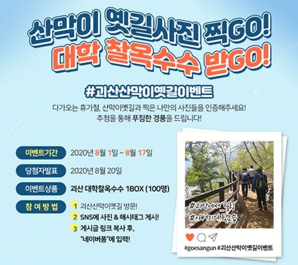 이번 SNS 홍보 이벤트는 8월 1일부터 17일까지 진행되며 이 기간 중 산막이옛길을 방문해 인증샷을 찍고 괴산군 공식 SNS 채널에 업로드하면 자동으로 참가할 수 있다.