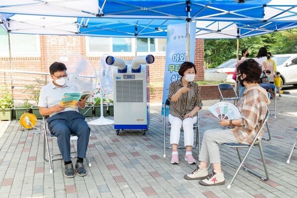 야외 무더위쉼터에는 구민들이 더위를 피해 쉬어갈 수 있도록 그늘막텐트와 냉풍기, 대형선풍기를 비치했다.