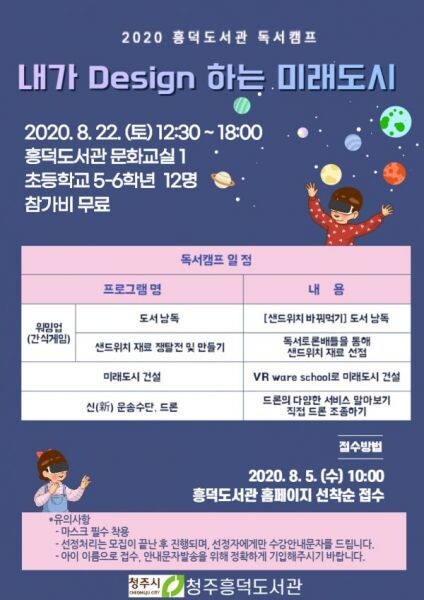 [무한뉴스] 청주흥덕도서관은 오는 8월 22일 12시 30분부터 오후 6시까지 문화교실에서 2020년 독서캠프 ‘내가Design하는 미래도시’를 운영한다.