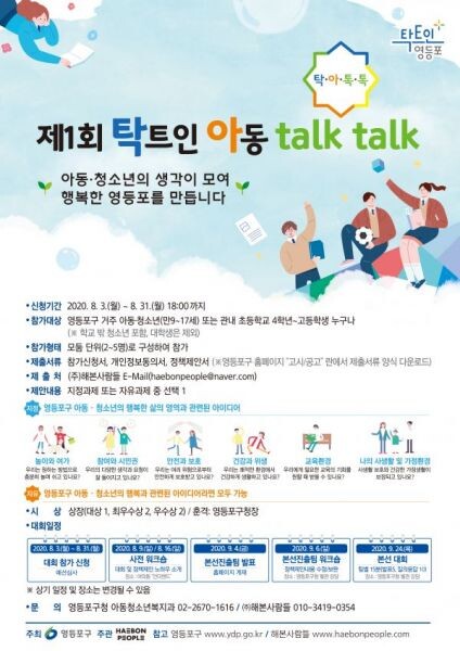 [무한뉴스] 영등포구는 아동·청소년의 목소리를 듣고 구정에 반영하기 위한 ‘제1회 탁트인 아동 talk talk’ 참가자를 오는 8월 31일까지 모집한다고 밝혔다.
