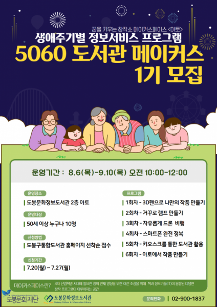 [무한뉴스] 도봉구는 오는 8월 6일부터 10월 29일까지 석 달 간 매주 목요일 도봉문화정보도서관에서 생애주기별 정보서비스 프로그램 ‘5060 도서관 메이커스’를 운영한다.