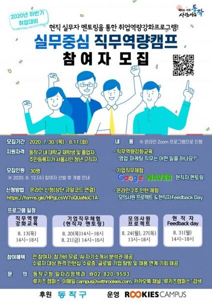 모집대상은 동작구 관내 대학교 재학생 및 졸업자, 주민등록지가 서울시인 청년 구직자로 동작구 홈페이지 ‘알려드립니다’ 내 “실무중심 직무역량캠프” 게시물에서 온라인 신청하면 된다.
