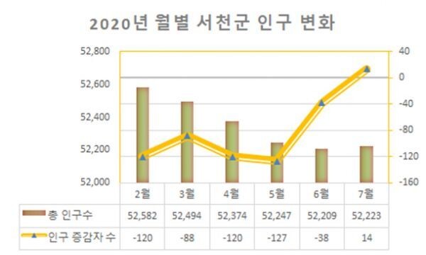 [무한뉴스] 서천군은 총인구수의 7월 집계 결과, 지속적인 감소를 멈추고 6월보다 14명이 증가했다고 밝혔다.