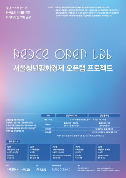 [무한뉴스] 서울시는 청년 스스로 한반도의 지속가능한 발전과 동북아 평화정착에 기여할 수 있는 미래 의제와 아이디어를 발굴하고 실행하는 ‘서울청년평화경제 오픈랩 프로젝트’를 진행한다.