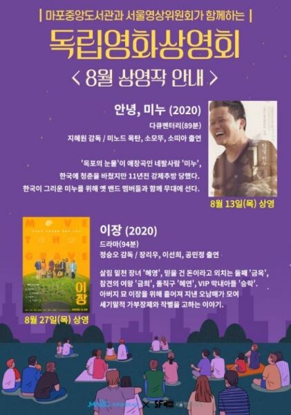 상영회는 8월부터 12월까지 매월 두 번째, 네 번째 목요일 오후 2시 30분부터 마포중앙도서관 마중홀에서 열린다.
