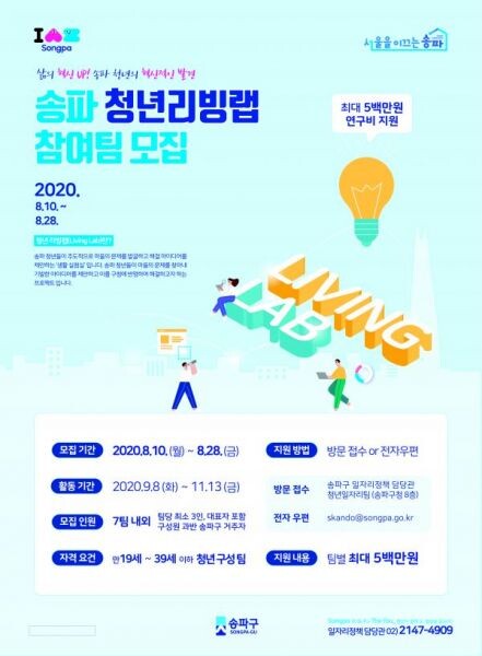 [무한뉴스] 송파구는 청년들에게 지역사회 관심과 참여 기회를 제공하고자 ‘2020 송파구 청년리빙랩’참가 청년 팀을 오는 8월 28일까지 모집한다고 10일 밝혔다.