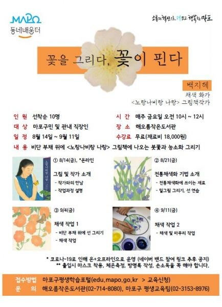 오는 8월 14일에 첫 개강하는 ‘꽃을 그리다 꽃이 핀다’ 프로그램은 수강생 10명을 선착순으로 모집해 전통 채색화를 배우고 비단 부채에 직접 꽃 그림을 그리는 과정이다.