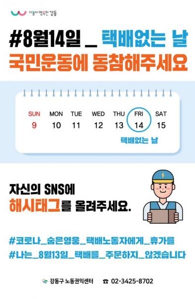 [무한뉴스] 강동구가 오는 ‘8월 14일 택배 없는 날’을 맞아 과중한 업무량에 시달리는 택배노동자의 노동권익 보호와 노동의 가치를 공유하기 위한 디지털 캠페인을 진행한다.