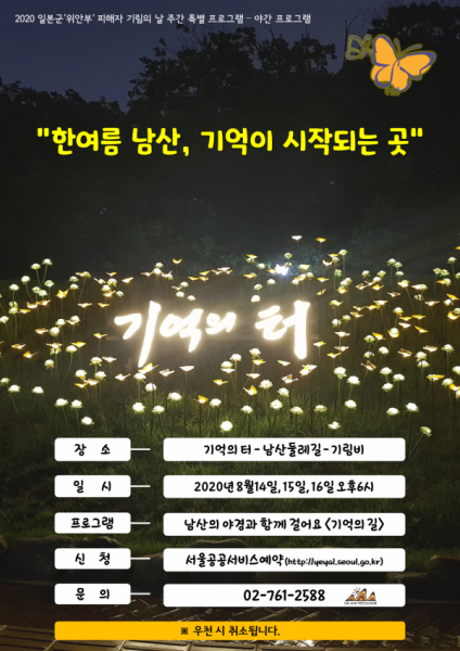 먼저, 14~16일 저녁 6시에는 ‘남산의 야경과 함께 걸어요 ‘기억의 길’’ 프로그램이 진행된다.
