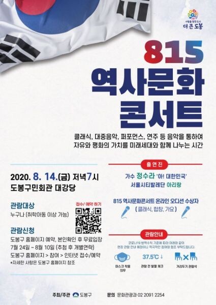 이번 ‘815 역사문화콘서트’ 공연은 오프라인 무대에 참석하지 못한 구민들을 위해 도봉구청 유튜브, 페이스북을 통해 실시간 라이브 방송 한다.