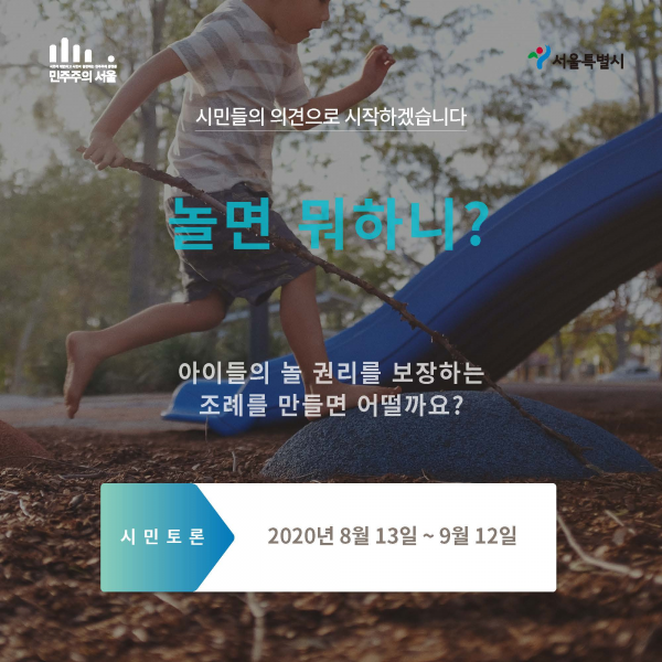 서울시는 시민참여 플랫폼 ‘민주주의 서울’ 에서 “아이들의 놀 권리를 보장하는 조례를 만들면 어떨까요?”라는 주제로 온라인 시민토론을 시작한다.