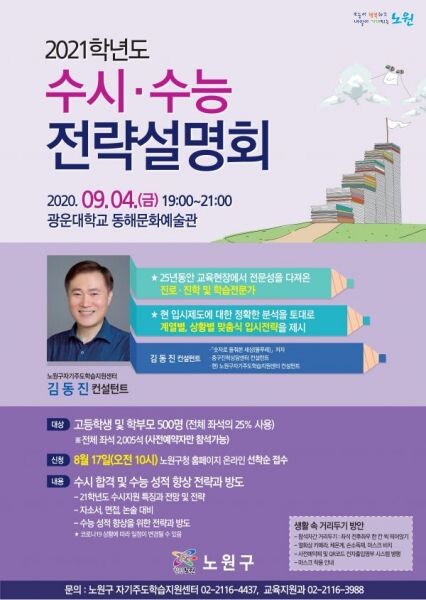 진행은 노원구 자기주도학습지원센터 초빙 컨설턴트 김동진 소장이 맡으며 주요내용은 2021학년도 수시지원의 특징 및 지원전략 자기소개서 면접, 논술 대비방안 수능성적 향상을 위한 전략과 방도 등을 다룬다.