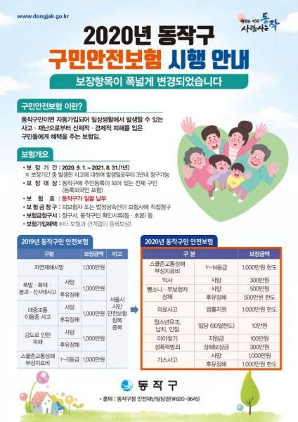 ‘구민안전보험’은 재난이나 사고로 구민에게 피해가 발생했을 때, 보험사로부터 보상을 받을 수 있도록 구가 보험료를 부담하는 제도로 2019년 5월, ‘서울시 동작구 구민안전보험 운영 조례’ 공포에 따라 구는 지난해 9월부터 구민안전보험을 도입해 운영하고 있다.