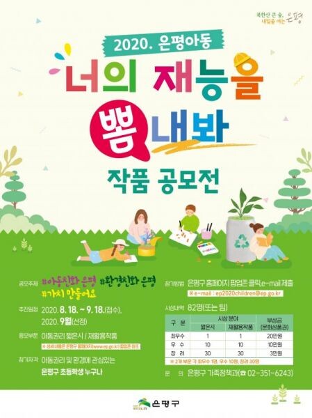 코로나19상황으로 집에서 긴 여가시간을 보내고 있을 어린이들이 가족의 소중함을 확인하며 함께 즐거운 경험을 가질수 있도록 마련한‘2020년 은평아동 ‘너의 재능을 뽐내봐’’작품 공모전은 #아동친화 #가족친화 #환경친화를 주제로 아동권리 짧은시와 재활용작품 2개 부문으로 진행된다.