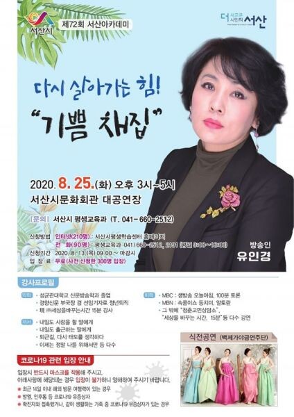 [무한뉴스]서산시가 오는 25일 오후 3시에 문화회관 대공연장에서 방송인 유인경 강사를 초청해 ‘다시 살아가는 힘 기쁨채집’이라는 주제로 제72회 서산아카데미를 개최한다고 밝혔다.