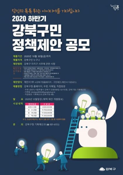 [무한뉴스] 강북구가 구민의 창의적인 고안을 구정에 반영해 행정서비스의 질적 향상을 기하고자 ‘2020 하반기 강북구 정책제안제도’를 운영한다.