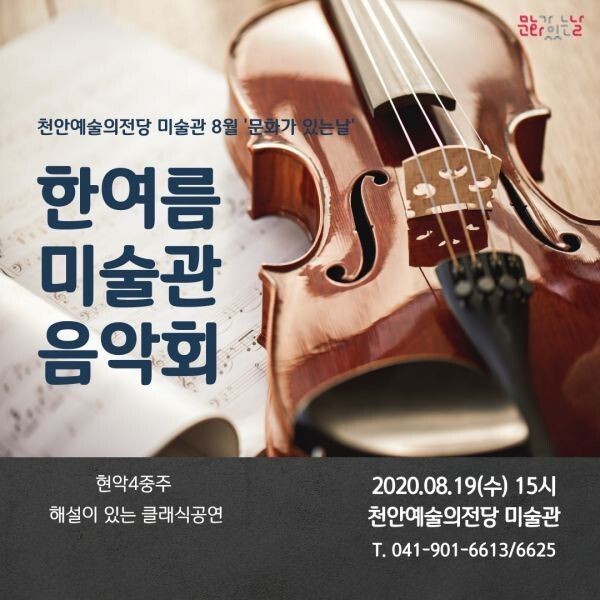 [무한뉴스] 천안문화재단 천안예술의전당미술관은 ‘8월 문화가 있는 날’을 맞아 오는 19일 수요일 오후 3시 ‘한여름 미술관 음악회’를 진행한다고 밝혔다.