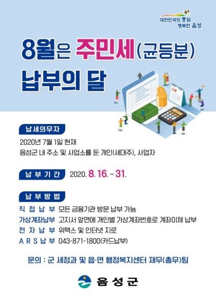 주민세 균등분 납세의무자는 7월1일 기준 음성군에 주소를 두고 있는 개인세대주, 사업소를 두고 전년도 부가가치세 과세표준액 또는 소득세법에 의한 총수입금액이 4800만원 이상인 개인사업자 및 법인사업자다.