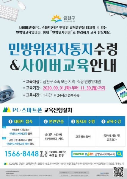 사이버교육은 9월 1일~11월 30일까지 진행되며 컴퓨터나 스마트폰을 사용할 수 없는 민방위 대원에 대해서는 서면교육도 병행 실시할 예정이다.