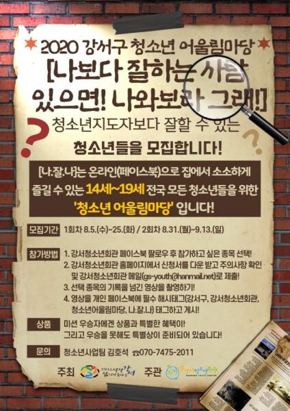 [무한뉴스] 서울 강서구는 코로나19로 실외 활동이 어려운 청소년들을 위해 집에서 즐길 수 있는 ‘나보다 잘하는 사람 있으면 나와보라 그래’를 개최한다.