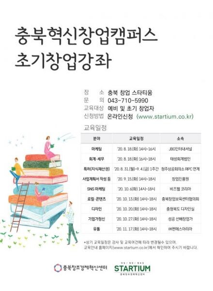 초기 창업 교육의 교육일정은 9월~11월 까지 진행되며 8월 18일 마케팅·회계·세무 교육 8월 31일~9월 4일 지식재산권 9월 15일 사업계획서 작성법 10월 6일 SNS 마케팅 10월 13일 로컬·콘텐츠 10월 20일 홍보물 디자인 10월 27일 기업가 정신 11월 17일 판로·유통 개척 등이다.