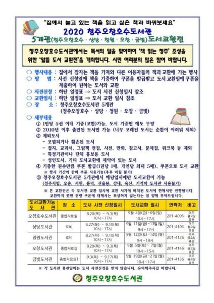 [무한뉴스] 청주오창호수도서관이 오는 20일부터 다음달 3일까지 ‘알뜰도서 무료 교환전’도서를 사전 신청 받는다.