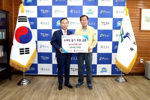 [무한뉴스] 박덕흠 의원이 19일 옥천군에 이번 집중호우와 용담댐 방류로 수해를 입은 주민들을 위해 수재 의연금품을 전달했다.