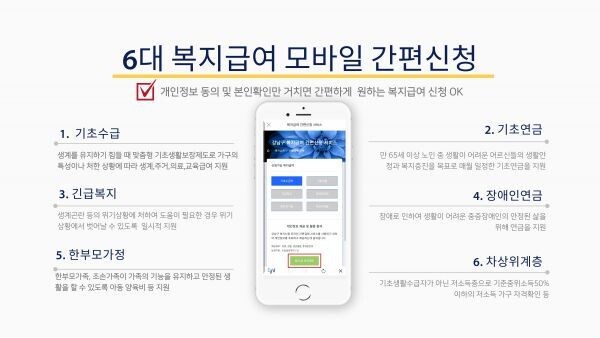 이번 서비스를 통해 ‘더강남’앱을 통한 휴대폰 인증과 간단한 정보 입력만으로 복지급여를 신청할 수 있으며 항목은 기초생활보장 긴급복지 기초연금 장애인연금 한부모가족 차상위계층 등으로 구분된다.