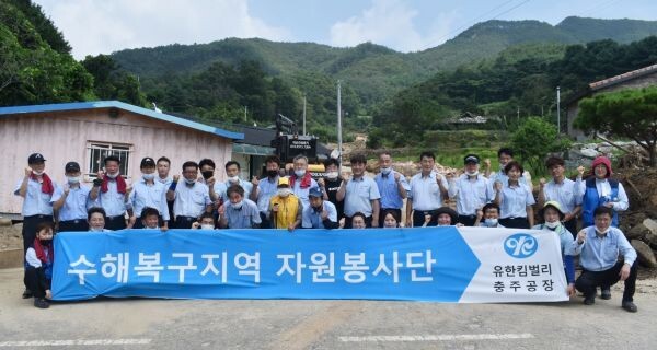 이날 유한킴벌리 충주공장 직원들은 폭염 속에서도 COVID-19 안전수칙에 따라 전원 마스크 착용 상태에서 수시 발열 체크와 소독을 병행하며 산사태로 인한 토사를 제거하고 침수된 가옥의 수습을 진행했다.