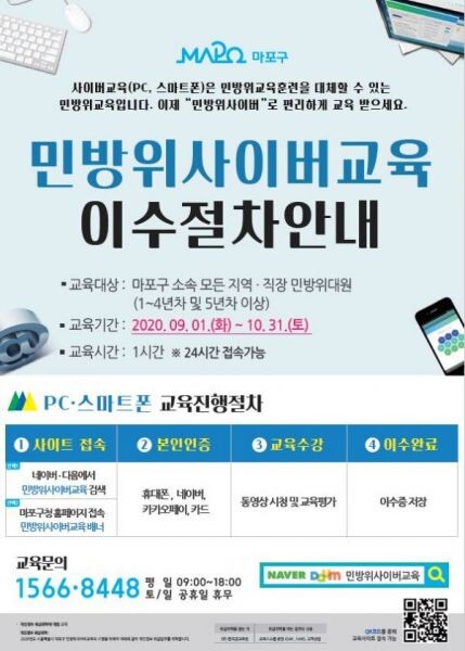 유동균 마포구청장은 “코로나19의 재확산 우려가 커지는 상황에서 이번 비대면 민방위 사이버 교육 실시는 지역사회 안전문화 확산에 기여하게 될 것이라 생각한다”며 “민방위대원들의 적극적인 교육 참여를 바란다”고 말했다.