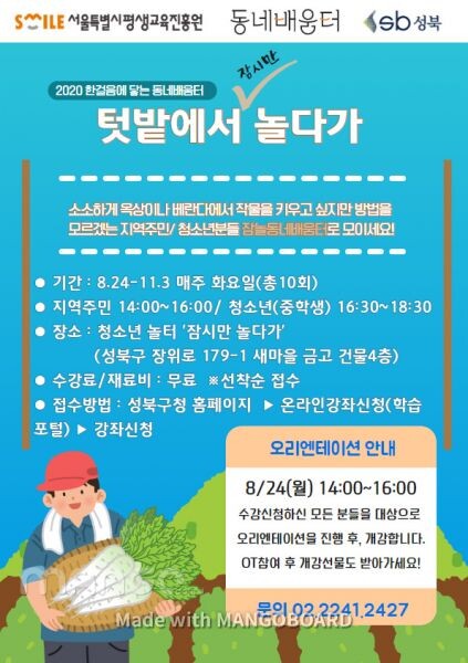 [무한뉴스] 성북구가 장위3동에 위치한 ‘잠놀 동네배움터’에서 지역 주민과 청소년들을 위한 ‘텃밭에서 놀다가’프로그램을 운영해 구민들에게 도시농부가 되는 비법을 공개한다.