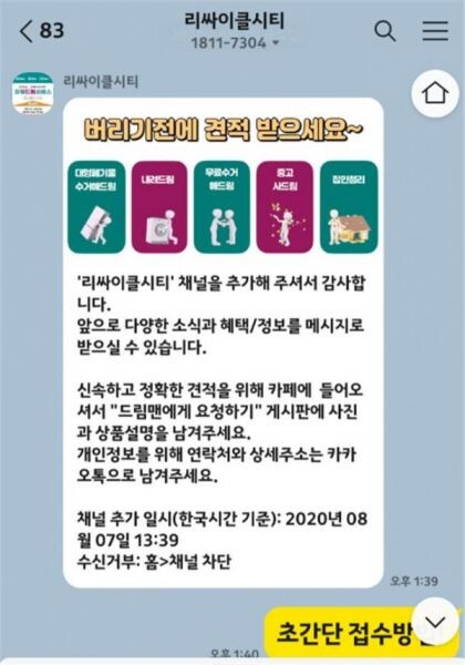 카카오톡에서 ‘리싸이클시티’를 검색해 채널을 추가하거나, 네이버카페에서 ‘리싸이클시티’를 검색해 회원가입 후 이용하면 된다.