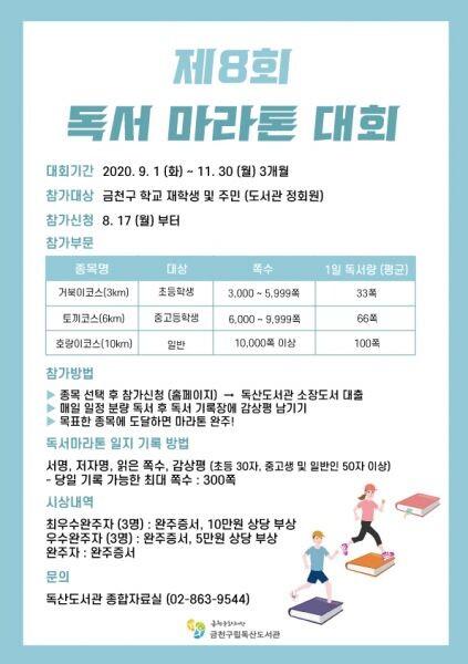 도서관 관계자는 “금천구립독산도서관은 ‘제8회 독서 마라톤 대회’가 주민의 인문학적 소양 증진과 책 읽는 공동체문화 형성에 기여할 것으로 기대한다”며 “이번 독서 마라톤 대회에 가족단위 주민여러분의 많은 참여를 바란다”고 전했다.